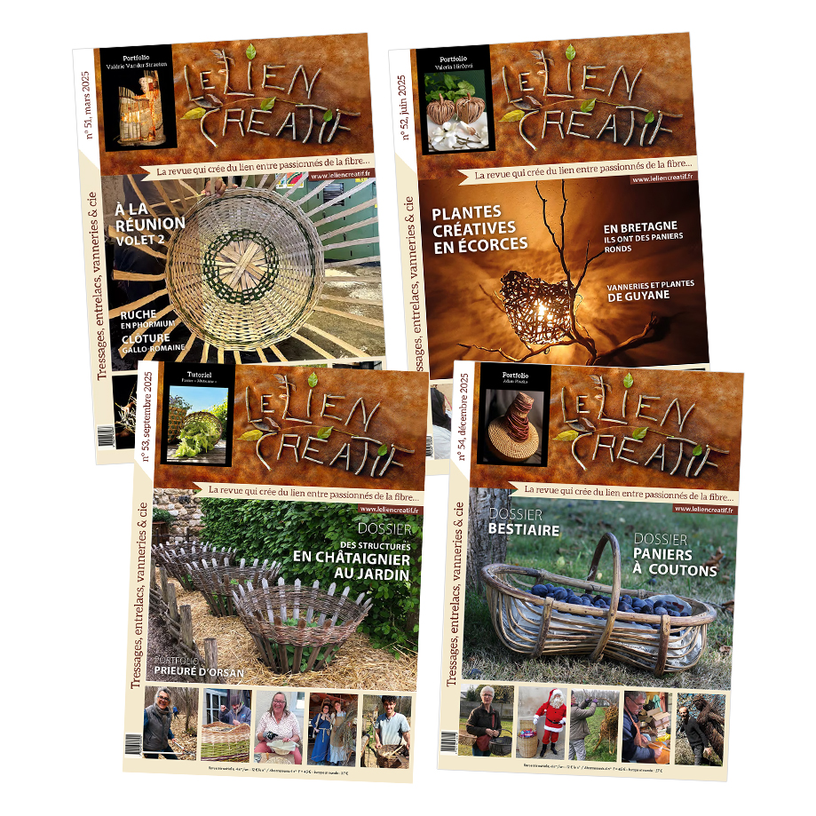 Ici s’expriment professionnels, amateurs, artistes .. bref les passionnés du tressage et des autres techniques associées. Créée en 2012, la revue est devenue un outil indispensable dans tous les clubs de vannerie. Le Lien Créatif est une source d’inspiration et une mine d’informations.