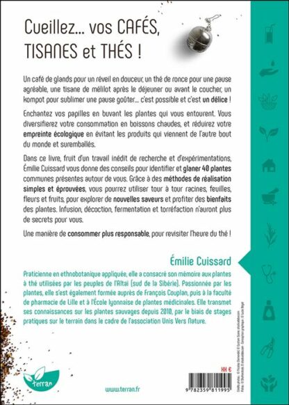Un café de glands pour un réveil en douceur, un thé de ronce pour une pause agréable, une tisane de mélilot après le déjeuner ou avant le coucher, un kompot pour sublimer la pause goûter… c’est possible et c’est un délice ! Enchanté vos papilles en buvant les plantes qui vous entourent. Vous diversifierez votre consommation en boissons chaudes, et réduirez votre empreinte écologique en évitant les produits qui viennent de l’autre bout du monde et suremballés. Dans ce livre, fruit d’un travail inédit de recherche et d’expérimentations, Émilie Cuissard vous donne des conseils pour identifier et glaner 40 plantes communes présentes autour de vous. Grâce à des méthodes de réalisation simples et éprouvées, vous pourrez utiliser tour à tour racines, feuilles, fleurs et fruits, pour explorer de nouvelles saveurs et profiter des bienfaits des plantes. Infusion, décoction, fermentation et torréfaction n’auront plus de secrets pour vous. Une manière de consommer plus responsable, pour revisiter l’heure du thé !