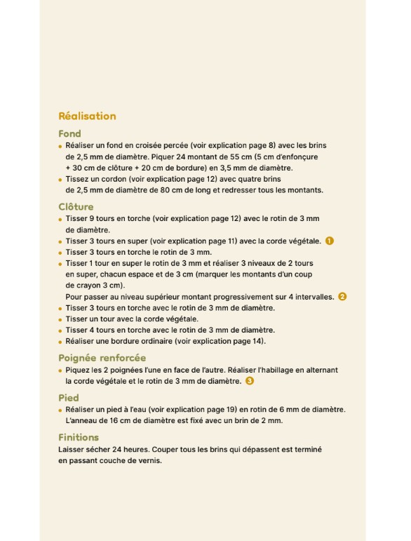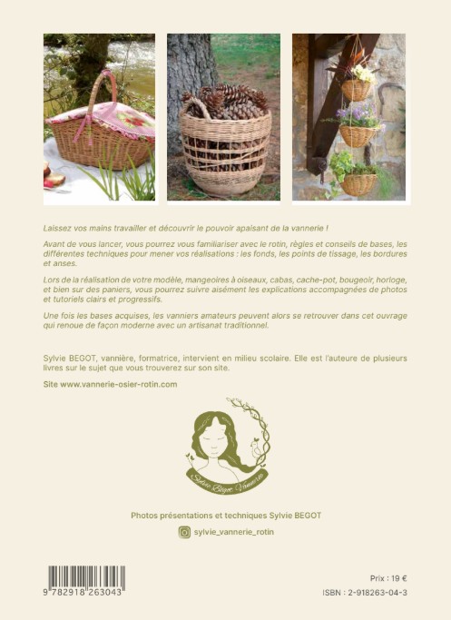 Avant de vous lancer, vous pourrez vous familiariser avec le rotin, règles et conseils de bases, les différentes techniques pour mener vos réalisations : les fonds, les points de tissage, les bordures et anses. Lors de la réalisation de votre modèle, mangeoires à oiseaux, cabas, cache-pot, bougeoir, horloge, et bien sûr des paniers, vous pourrez suivre aisément les explications accompagnées de photos et tutoriels clairs et progressifs. Une fois les bases acquises, les vanniers amateurs peuvent alors se retrouver dans cet ouvrage qui renoue de façon moderne avec un artisanat traditionnel.